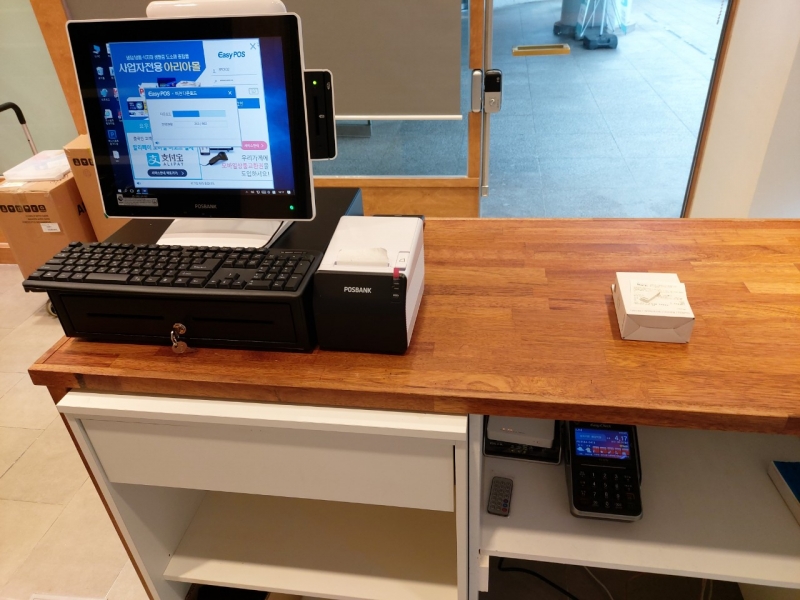 설치장비 : APEXA 포스, 듀얼모니터, 유선단말기 TS-167, 결제가능 서명패드 EP-705